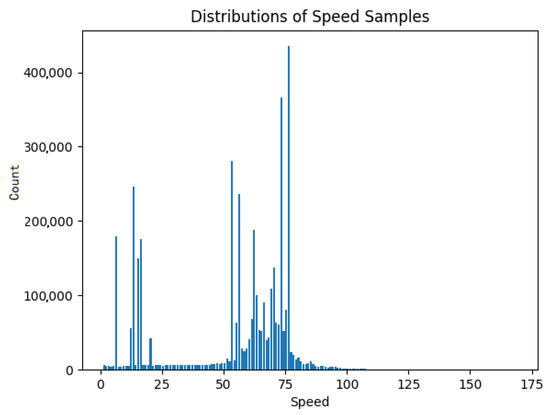 The univariate outlier detection focused mainly on the “speedOBD” metric which is the value of the speed as the latter is calculated by the tachometer of the vehicle. The four million data records for the speed measurement are distributed as presented in Figure 2.