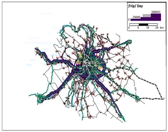 The Unified Traffic Model of Budapest (EFM) is chosen for the study, which was created and is maintained by the Transport Corporation of Budapest and is developed using PTV Visum software. The model uses real-life collected traffic data of Budapest. The model’s transportation data includes private and public datasets, such as daily traffic volume, origin–destination matrices, public transport modes and routes. The model also consists of all road characteristics and allowable mode to use different roads. The model is illustrated in Figure 1.