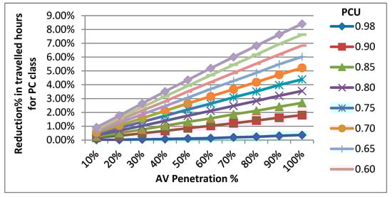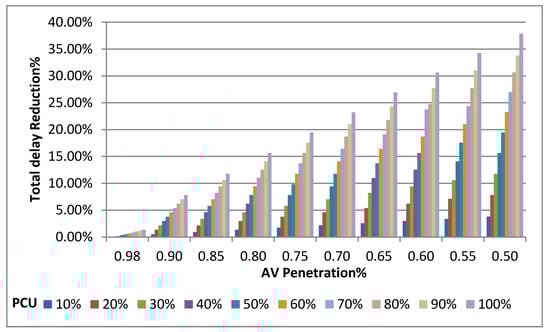 Reduction percent in total delay for different AV penetration and PCU.