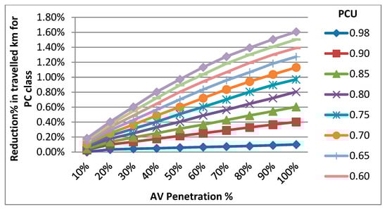 The second investigated AV characteristic is the value reduction of road saturation, represented by Passenger Car Unit (PCU) capacity modification factor in the Visum EFM model. PCU of different vehicles is required to convert a mixed traffic stream into a homogeneous equivalent, thereby expressing the mixed traffic flow in terms of an equivalent number of passenger cars []. PCU reflects how much impact a specific transport mode has on traffic variables compared to one regular passenger car. Modifying PCU values for the AV class is structured on the expected positive effect of connected AVs on roads capacity and saturation characteristics []. The saturation reduction is mainly achieved by lower following distance and headway between vehicles and other factors such as: