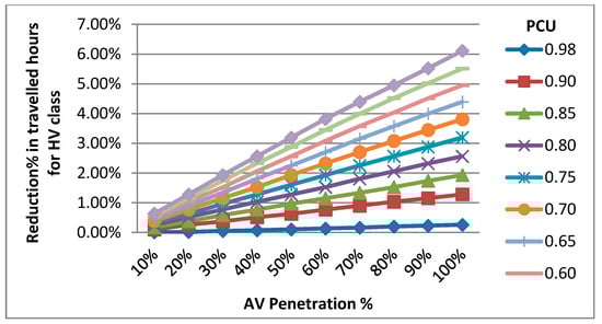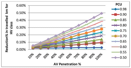 The proposed methodology of the employment of connected AVs in the network at different PCU and penetration for the same number of daily trips reduces daily traveled hours and daily traveled kilometers for the passenger car class. The outputs vary from small reductions at lower PCU and penetration values (111 saved traveled hours and 926.5 saved traveled kilometers at 0.98 PCU and 10% AV penetration) to much larger reductions at higher PCU and penetration values (537,000 saved traveled hours and 530,186 saved traveled kilometers at 0.50 PCU and 100% AV penetration). The second class investigated is a heavy vehicle with four different categories. It is found that there is a marginally small improvement in the network traffic parameters even though no modifications are added for any heavy vehicle parameter in any simulations. This shows that AV spread in the network improves the network operation for all traffic flow and all vehicle classes (40 saved traveled hours and 2855 saved traveled kilometers at 0.98 PCU and 10% AV penetration) Much larger reductions are witnessed at higher PCU and penetration values (176,650 saved traveled hours and 778,420 saved traveled kilometers at 0.50 PCU and 100% AV penetration). Figure 2, Figure 3, Figure 4 and Figure 5 give a better illustration of the improvement of the network operations by presenting the reduction percentage of traveled hours and kilometers for both passenger car and heavy vehicle classes, respectively. Reduction in traveled hours varies from 0.02% to 8.41% for passenger cars and from 0.01% to 6.11% for heavy vehicles. Reduction in traveled kilometers varies from 0.03% to 1.61% and from 0.02% to 0.49% for passenger car and heavy vehicle classes, respectively.