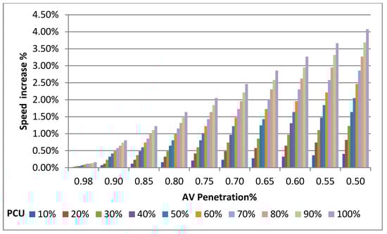 Increase percentage in mean network’s speed for different AV penetration and PCU.