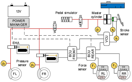 The target vehicle, discussed in this study, uses a hybrid brake-by-wire system of Brembo Company (Stezzano, Italy). Figure 1 shows the hydraulic circuit of the electro-hydraulic callipers in the front and the wiring to the electro-mechanical sliding callipers in the rear, including all applied sensors and control units. The indices FL, FR, RL, and RR indicate the front left, front right, rear left, and rear right corners, respectively.