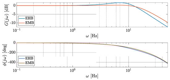 The used, hybrid brake-by-wire system originally incorporates blending functionality, but without any switching valves, as typically used in centralized systems, its distributed architecture allows individual and continuous control of the clamping force (or pressure) over the four corners. The dynamics of the system are shown by the transfer function in Figure 2. It can be seen, that the maximum modulation frequency is about 12–13 Hz, which is mainly based on the characteristics of the electro-mechanical components and software calibration and has to be considered in the controller design.