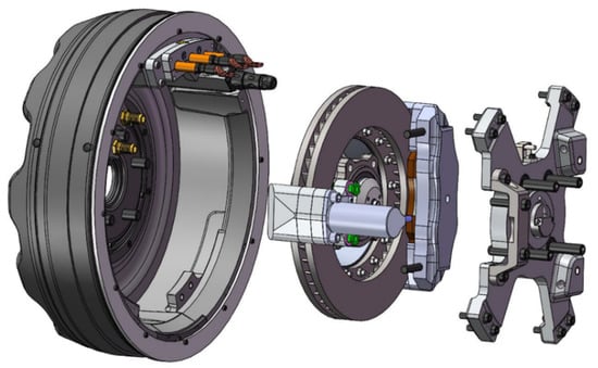 Besides the decoupled braking system, the target vehicle is equipped with in-wheel machines on the rear axle, see Figure 3, provided by Elaphe Propulsion Technologies Ltd. (Ljubljana, Slovenia). The machines used are based on liquid-cooled synchronous machines with a maximum power of 110 kW and a maximum torque of 1.500 Nm in boost mode. Additionally, they are designed for a wide range of vehicular applications such as sedans, SUVs, pick-ups or small cargo trucks. The knuckle adapter fits most vehicles on the market, enabling easy implementation. It also includes a friction brake device with Electronic Parking Brake (EPB), which was replaced in the presented application to install the electro-mechanical sliding callipers from Brembo.