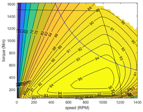 Motor efficiency plot for L1500 in-wheel machines. The black line shows the motor natural characteristics with field weakening.