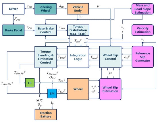 To bring the benefits and functionality of the drivetrain and brake system together, a suitable control strategy is needed. Therefore, a combined and integrated controller was developedthat was able to provide common safety functions, such ABS and was also enhanced by functionalities such as regenerative braking through the IWMs. The present article was intended as a case study for the adaptation of the outcomes of [22,23,26] to the new, mechatronic systems. Figure 5 shows the controller structure as a block scheme.
