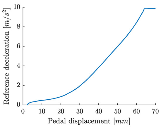 Right after the detection of the driver inputs, the base brake controller converts the brake pedal displacement into a corresponding torque request Tdem. Equation (5) contains the mathematical description, where rw is the wheel radius and aref describes the reference deceleration that relates to the pedal feel characteristic as shown for the target vehicle in Figure 6.