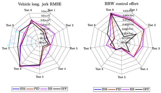 Therefore, the braking distance became less interesting for those test cases, but the stability criterion stepped into the foreground. As described at the beginning of this section, deactivated control seemed to be advantageous in ride comfort, but it failed in terms of vehicle stability as the blocked wheels did not guarantee a sufficient transmission of lateral forces. It can be seen in this case that the continuous approaches are showing similar performances, while there are significant improvements with −93.6% (case 7)/97.1% (case 8) for PI and −54.6% (case 7)/−97.1% (case 8) for ISM compared with the deactivated control. Compared to the rule-based control, which already showed much better performance than deactivated WSC, the continuous approaches showed noticeable improvements of −46.3% (case 7)/−51% (case 8) for PI control and −46.5% (case 7)/52.3% (case 8) for ISM. It becomes clearthen, that there was no scenario with higher improvements through continuous control than in the braking manoeuver from 60 km/h to standstill on µ-split road (test case 8). Additionally to the stability improvements, there was also a reduction of the longitudinal jerk by ~30%.
