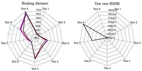 Regarding vehicle stability, test cases 1 to 6 were quite uninteresting since a homogeneous surface with a constant friction coefficient was assumed. The results on underground surfaces with inhomogeneous friction conditions (µ-split, test cases 7–8) or even randomly distributed patches with different friction coefficients (test case 9) were more interesting, as the vehicle tended to turn around its COG because of the emerging yaw moment produced by different longitudinal forces on the left and right wheels.