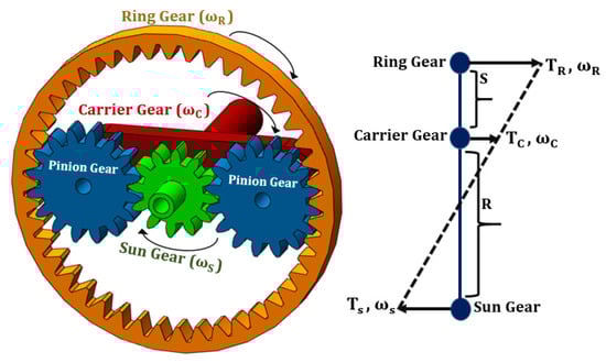 Planetary gearbox is the main gearbox of the hybrid powertrain and may contain one or more planetary gears. A PG consists of the sun gear, the ring gear and the carrier gear with several pinions. Lever analogy [] is used to demonstrate the dynamics of 1-PG powertrain, as shown in Figure 1. The angular velocities of sun gear, ring gear and carrier gear must satisfy the constraint equation given in Equation (1) [].