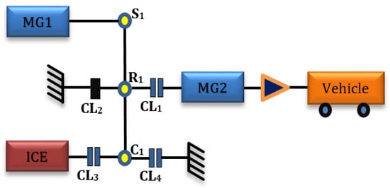 The 1-PG topology with four clutches [] is shown in Figure 2. Depending on the clutch engagements, four modes can be generated, which are described in Table 2.