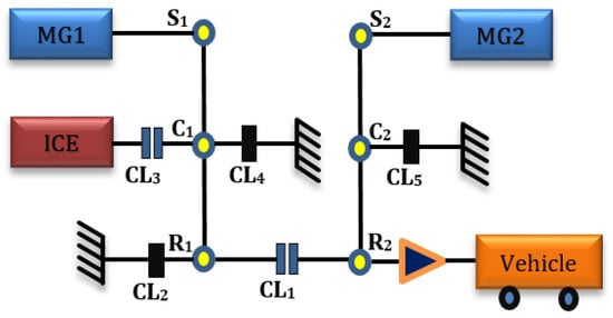 For the drivetrain with 2-PG topology, MG2 connects to the sun gear of the second PG (), MG1 connects to the sun gear of the first PG (), whilst the engine connects to the carrier gear of the second PG (). The 2-PG topology with five clutches [] is shown in Figure 3, where four different modes can be produced according to the clutch engagements (similar to the 1-PG topology modes). The governing equations corresponding to all modes for the 2-PG topology are as follows: