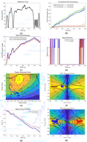 Simulation results for (a) US06 drive cycle, (b) Engine, equivalent, and total fuel consumption, (c) Total fuel economy, (d) Mode selection as given in Table 2, (e) Operating points of engine, (f) Operating points of MG1, (g) Battery state of charge for 1-PG and 2-PG topology, (h) Operating points of MG2.
