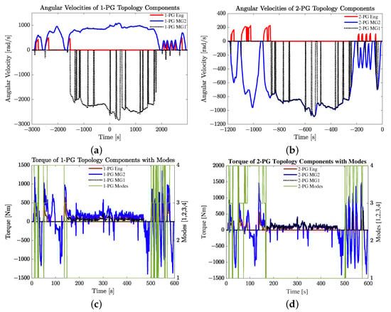 Figure 4h presents the resulting operating points of MG2, which has a significant impact on the total fuel consumption of the topologies as the main source of power in Modes 1, 3 and 4. The main difference between the operation of MG2 in the 1-PG and 2-PG topologies is in the direction of rotation, as in Figure 4h. Figure 5a,b illustrate this fact with more details. Moreover, Figure 5c,d indicate the details of the torques contributed by different components. This change of direction of rotation of MG2 makes reduction of engine speed in Mode 3 possible, as discussed before.