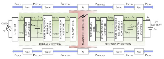 The key elements of a WPT system are the coupling coils and the related compensation networks. Nevertheless, the design of their reactive parameters relies upon the operating parameters of the HFPC and HFSC and, more specifically, on the currents and voltages IHFPC, IHFSC, VHFPC and VHFSC. In turn, these values depend upon the grid-side and battery-side sizing values reported in Table 2 and upon the operating parameters of the FEC and BC, which set the maximum values of the quantities IFEC, VDCP, IBC and VDCS. The sizing of the coils and compensation networks can be realized only after a first approximation design of the power converters, performed from the external ones (i.e., FEC and BC) towards the internal ones (i.e., HFPC and HFSC).