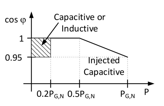 The main purpose of the BWV2H is recharging the battery of the electric vehicle; nevertheless, in certain conditions, part of the stored energy can be released towards the domestic loads, with the possibility of injecting it in the grid if it is higher than the overall power absorbed by the home appliances. For this reason, the Italian reference technical rules for the connection to the LV electrical utilities (CEI 0-21) [18] categorizes the BWV2H as an active user, also called a prosumer. It is worth noting that the contractual power sets the limits for the maximum absorbable power, but it is not effective for the injected one. In addition, [18] requires that the FEC exchanges reactive power with the grid, according to the diagram of Figure 4. It is shown that when the injected power is between 0 and 0.2PG,N the prosumer can behaves either as an inductive or capacitive load, provided that the power factor cos (φG) is in the range of 0.95 < cos (φG) < 1. When injecting active power in the range 0.2PG,N < PG < 0.5PG,N, cos (φG) must be maintained at 1. Lastly, when the power is higher than 0.5PG,N, the user has to inject reactive power of the capacitive type, behaving as an inductive load, when the grid voltage exceeds a certain lock-in value (f.i., 1.05 VG,N).
