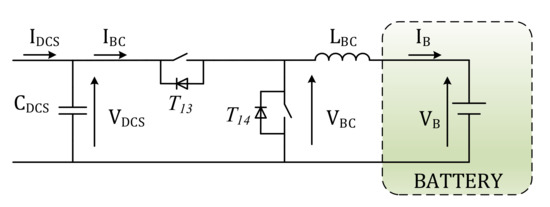 The BC works as a buck converter during charging mode and as a boost converter during discharging mode. Then, it is a two-quadrant DC/DC converter with the possibility of reversing only the current. Its task is to regulate the battery current IB and voltage VB during the charging and discharging process, according to the voltage–current profile supplied by the battery manufacturer. The BC scheme is shown in Figure 7.