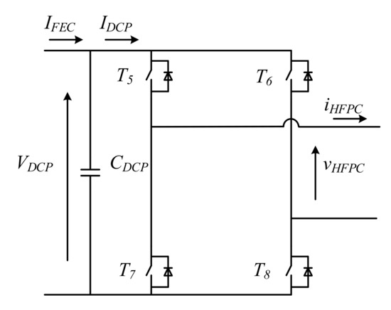 whose maximum value corresponds to (29). During discharging mode, the voltage vHFPC is a square wave voltage, in phase with the current iHFPC and with an amplitude of the fundamental component equal to (28). The H-bridge schematics of HFSC is shown in Figure 9, where the current direction is drawn according to the charging mode.