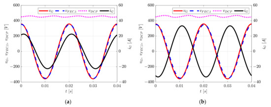 Analysis of (15) shows that VFEC,1 is maximum in the condition of maximum grid current and voltage IG,M and VG,M, respectively, maximum grid angular frequency ωG,M = 316.04 rad/s and minimum power factor cos (φG,m) = 0.95. From these values, it is established that VFEC,1,M = 368.88 V. Figure 5b shows that the maximum FEC voltage is reached either during charging mode with the current leading the grid voltage or during discharging mode with the current lagging the grid voltage.