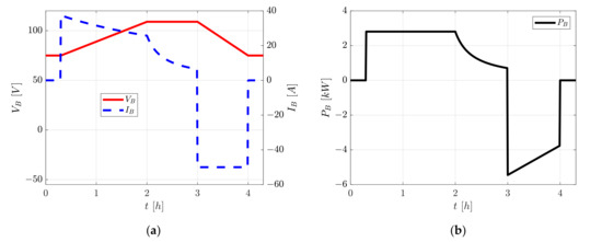 - 3–4 h: the battery is in discharging mode. The voltage decreases reaching the minimum value VB,m. The battery delivers the nominal current IB,N,d. The power is maximum only for the first instants when the battery voltage is equal to VB,M, since the current is fixed at IB,N,d; then, the power follows the voltage profile.