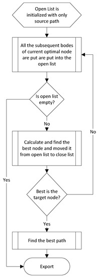 - Hart, P.E.; Nilsson, N.J.; Raphael, B. A Formal Basis for the Heuristic Determination of Minimum Cost Paths. IEEE Trans. Syst. Sci. Cybern. 1968, 4, 100–107. [Google Scholar] [CrossRef]