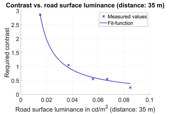 Influence of the roadway luminance on the Weber contrast required for object detection. According to Damasky [], the necessary Weber contrast decreases with increasing roadway luminance. This behavior can be described by a rational fit function.