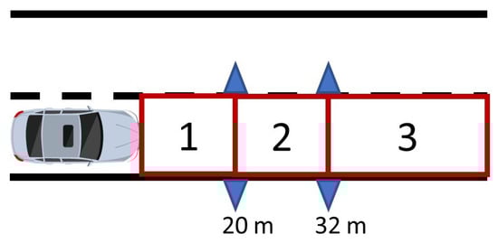 After having finished the static test condition, each participant was asked to indicate the relevance of different areas in the vehicle forefield with regard to how they had performed their brightness evaluation. For this purpose, pylons were used to divide the driver’s lane into three different areas according to Kleinkes [] and Kobbert []. The first area, the so-called near field, extends from 0 to 20 , the second area, the mid field, from 20 to 32 , and the third area, the far-field, from 32 to the vanishing point of the road, see Figure 2.