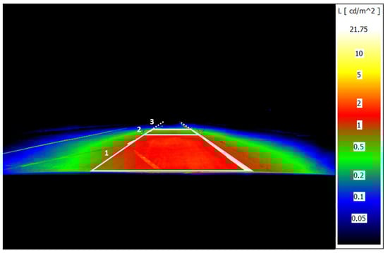 Spatial luminance distribution in the forefield of the test vehicle as obtained for a maximal headlamp PWM value of 255, captured by using a TechnoTeam LMK 5. Area 1 (near field): 0 –20 , area 2 (mid field): 20 –32 , area 3 (far field): >32 (to vanishing point of road).