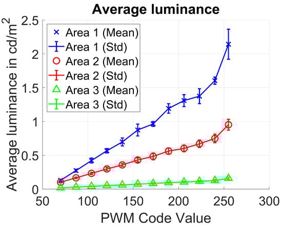 Mean luminance values (data points: crosses—area 1, open circles—area 2, triangles—area 3) and standard deviation (Std) as a function of the PWM code values representing the twelve different brightness settings of the static experiments.