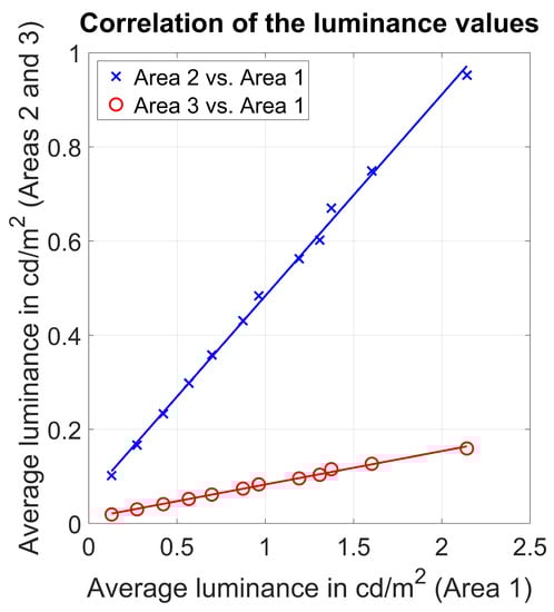 Simple linear regression is applied to determine the correlation of the average luminance between the different evaluation areas. As can be seen from Figure 5, there is a significant linear relationship between the average luminance of the near-field and the average luminance of both the mid-field, , , , and the far-field, , , , where r is the Pearson’s correlation coefficient and denotes the coefficient of determination.