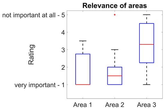 The assessment of the relevance of the different vehicle forefield areas (see Figure 2 and Figure 3) for the evaluation of the subjects’ brightness perception was conducted under static conditions (0 km h−1). The results are summarized in Figure 6. Corresponding box plots illustrate the subjects’ median ratings and quantiles for each of the three different evaluation areas.