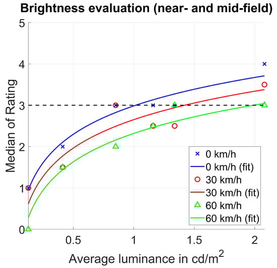 In addition, it should be noted that by applying the proposed model equation the lower feeling of safety threshold luminance of about 1 cd m−2, which was identified by Kleinkes [] for his static test conditions as the transition point between “dark” and “bright” ratings, can also be confirmed here. With increasing driving speed, this threshold luminance shifts towards higher values. From Figure 7, it can further be seen that, with increasing driving speed, the median of the brightness evaluation follows a decreasing trend.