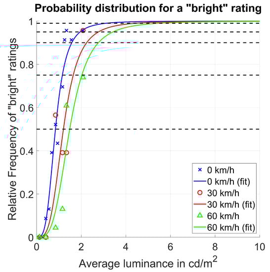 In addition to the provided analysis of medians to explore general trends, it is also of interest to determine, as a function of velocity, the adequate feeling of safety luminance threshold for different speed levels. For this purpose, the relative frequency of “bright” or better ratings (cf. Wagner and Khanh []) is determined for each examined roadway luminance as obtained for the three different test conditions at 0 km h−1, 30 km h−1, and 60 km h−1, respectively. The analysis is performed by employing logistic regression, using the psychometric function defined by Linschoten et al. []: