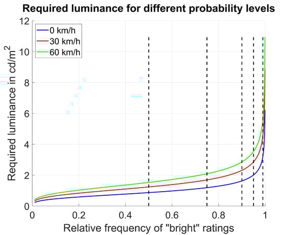 Required luminance for different probability levels of “bright” or better ratings at different speed levels. By using the calculated inverse functions, the minimal roadway luminance, which is required for a “bright” or better evaluation with a certain probability (dashed lines: probability levels 50%, 75%, 90%, 95%, and 99%), can be determined as a function of velocity.