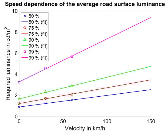 As shown in Figure 9, for higher probability thresholds beyond 80%, the required roadway luminance increases quite strongly. Again, it can be confirmed that with increasing driving speed, the required roadway luminance for achieving a certain threshold related to “bright” or better ratings also increases. To investigate this effect in more detail and with the goal of extrapolation to higher velocities, a simple linear regression should be performed, including four common probability thresholds, i.e., 50%, 75%, 90%, and 99%. The individual regression curves are shown in Figure 10. The corresponding coefficient of determination is always greater than 0.99, confirming the linear relationship between driving speed and the required roadway luminance to achieve a certain evaluation threshold for “bright” or better ratings to promote an adequate feeling of safety (cf. Wagner and Khanh []).