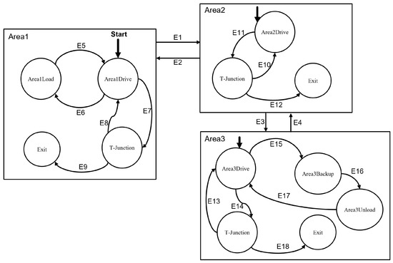 Each stage of the operation represents a meta-state in the FSM and the checkpoints in the road topology defined determine the state transitions. The operational meta-states listed can be further grouped into three larger meta-states each pertaining to A1, A2, and A3 operation as outlined in Figure 2. Hence, each area has a group of operational meta-states that defines the truck’s maneuver and these areas are transitioned through the T-junction states. The loading state of the truck determines whether the truck is moving towards A1 (unload-haul-load operation) or A3 (load-haul-unload operation). Waypoints and the GPS position indicate to the vehicle what meta-state in the FSM to use. The state transition events are defined in Table 1.