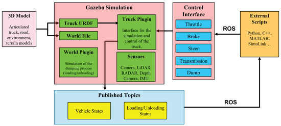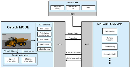 The simulation environment provides an integration interface with MATLAB and Simulink through the ROS framework as shown in Figure 7. This allows for the operation control architecture to be developed externally but simulated on our vehicle model and environment.
