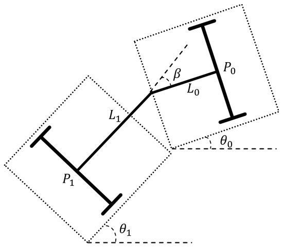 A multi-body point mass kinematic model is considered for both the front and rear chassis. The four rear wheels are combined to form a single axle at their midpoint. The coordinate frame of the truck model is given in Figure 8 where identifies the body, is the midpoint of the axle given in Cartesian coordinates , is the orientation angle of the midpoint of the axle, is the articulation angle, is the velocity vector, and is the distance between the axle midpoint and the articulation point.