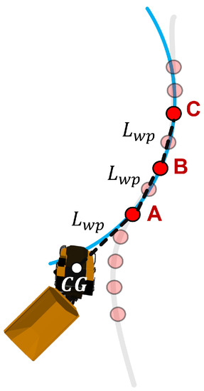The minimum distance between the path waypoints considered for fitting, , is dependent on the sampling rate of the controller, and the velocity of the truck, v,