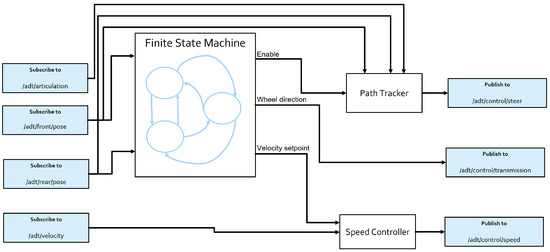 Integration of the FSM and path tracking module in the simulator. The modules subscribe to the topics published by the simulated ADT and publish control commands to the control interface provided.