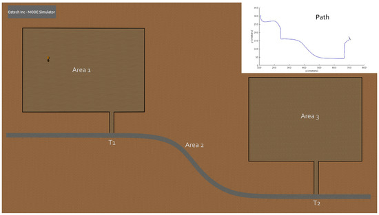 An environment model shown in Figure 4 was developed in Blender to represent the given operation description (Figure 1). The environment consists of two areas, loading and unloading, and an asphalt road connecting the two areas. A T-junction exists at the entrance/exit of each area to the roadway.