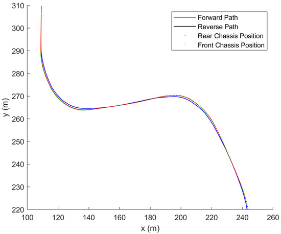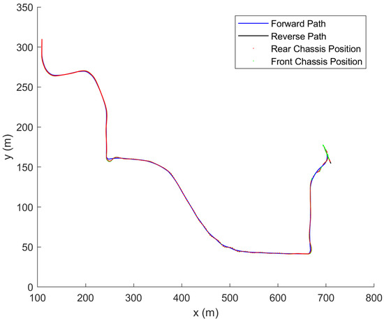 where K is selected as a feedback gain row vector to stabilize the closed loop system and . This path tracking controller is capable of tracking in both the forward and reverse directions. The equations in this subsection along with the proofs are presented in [17].