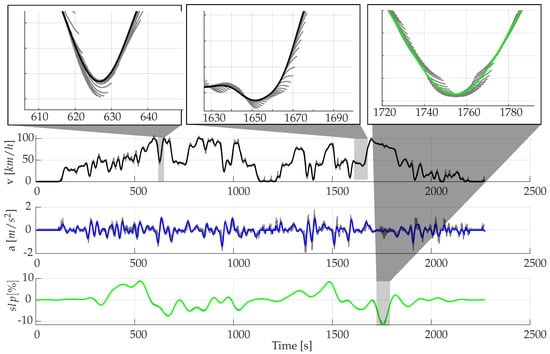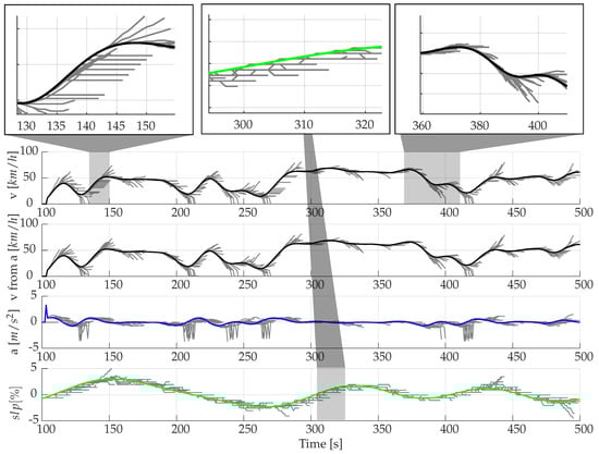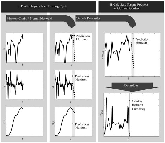 It can be seen that the torque is influenced by the vehicle-specific parameters as well as by the driving cycle-specific quantities velocity, acceleration, and road slope. Predicting the latter offers the possibility to improve a non-predictive Equivalent Consumption Minimization Strategy (ECMS) [,,] or to implement other approaches like MPC [,,].