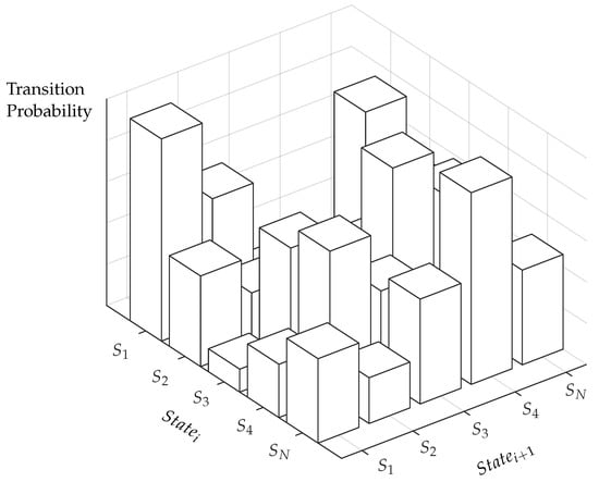 If this probability distribution is limited to the current state without taking into account past values, this can be stated as a first-order MC. If we further denote the states as S, the state at time t as , and the transition probability from state i to state j as , the following applies []: