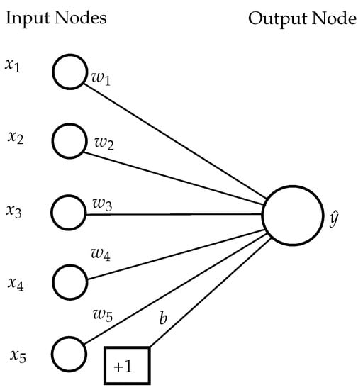 The output value is a result of taking into account the input variables corresponding to the d features, the bias b, the weights of the connections between the input layer and the output neuron , as well as the activation function , according to the following relationship []: