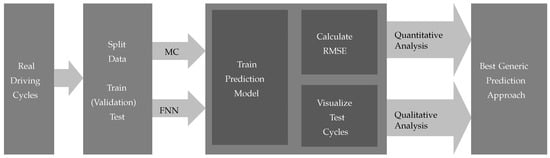 The basic procedure is shown in Figure 4. Here, the real driving cycles further described in Section 4.1 are first divided into training, validation, and test data in the ratio 60:20:20. Subsequently, models for MC and FNN are trained. Through a subsequent analysis of the calculated RMSE values of velocity, acceleration, and road slope as well as by analysing the predictions with corresponding plots of the whole driving cycle, the optimal generic prediction approach for the purpose described will be finally selected.