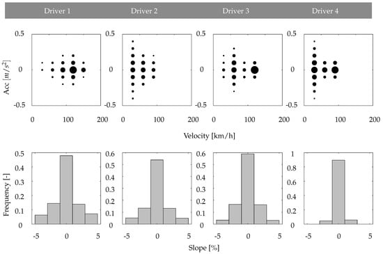 It can be concluded that driver 1 drives mostly on the highway. Driver 2 is characterised by the highest proportion of standstill times and the highest average accelerations. As the v-a plot further shows, driver 2 primarily drives in urban areas and occasionally on country roads. As also shown in Figure 5 the focus of driver 3 is on city driving or driving on the highway at a constant speed of 120 km/h. The rides of driver 4 also have a high proportion of low acceleration, especially on country roads in the 80–100 km/h velocity range. Regarding the driven road slopes, driver 4 has hardly any road slopes in the range of ±5%, while drivers 1–3 have a similar distribution.