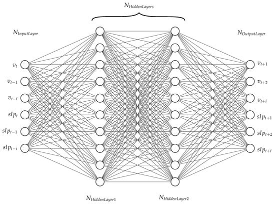 In this context, the activation function is applied to the weighted sum of the input values and thus finally determines the output value of the neuron. A typical activation function is, for example, the Rectified Linear Unit (ReLu), but other functions can also be used depending on the application []. This basic principle can also be transferred to more complex neural networks. Here, the output values of one layer result in the input values for the neurons in the next layer. For a comprehensive overview of FNN including the various calibration possibilities, the reader is referred to [].