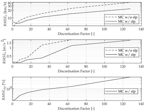 For the choice of a suitable discretisation, the discretisation is increased by a discretisation factor on the basis of the values in the literature [,]. The studies are shown in Figure 7. Due to the convergence of velocity and acceleration, the proposed parametrisation of Table 3 (discretisation factor of 1) can be confirmed as suitable. As can be seen, the converges to ≈5 km/h, and the converges to ≈0.3 m/s for a prediction horizon of 10 s for the chosen test dataset.